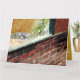 雪の降る中、キャンドルの温かい火と眠っている犬が見える窓辺を描いたカード。