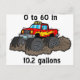 Ein Cartoon eines LKW mit großen Reifen, die den Schmutz aufreißen. Die Wörter 0 bis 60 in 10,2 Gallonen, die sie umgeben. Lasse zumindest versuchen, unsere Gasreserven zu erhalten.