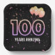 Party Ballons und Konfetti auf schwarzem Hintergrund mit der Neonnummer 100 für eine 100. Geburtstagsfeier. "Jahre Phantastisch" kann bearbeitet oder gelöscht werden.