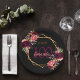 Ein Teller für eine 100. Geburtstagsfeier. Ein schicker schwarzer Hintergrund mit einem geometrischen Rahmen für Imitate. Die Einrichtung besteht aus dunklen, lila und bordeauxfarbenen Blume, Rose und Boho-Federn. Vorlagen für einen Namen, 100 Jahre und ein Datum. Geburtsdatum oder Geburtsdatum des Party. Der Name wird mit handgeschriebenem Stilskript, rosa Buchstaben, lila Alters und goldenen Zahlen geschrieben.