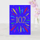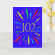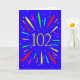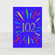 Une carte explosive 102e anniversaire ! Quelle merveilleuse façon d'envoyer des salutations d'anniversaire. Le numéro 102 en jaune vif avec une explosion de couleurs vives et d'étoiles.