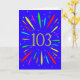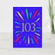 Une carte explosive du 103e anniversaire ! Quelle merveilleuse façon d'envoyer des salutations d'anniversaire. Le numéro 103 en jaune vif avec une explosion de couleurs vives et d'étoiles.