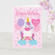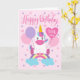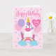 Ein bezauberndes Einhorn auf einem Regenbogen, umgeben von Ballons und Konfetti. Auf der Oberseite der Karte befinden sich die handgeschriebenen Worte "Happy Birthday", während der herzförmige Ballon die handgeschriebenen Worte "heute eins" hat. Eine perfekte Karte für den 10. Geburtstag eines Mädchens!