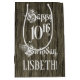 Dieses aufwändige und formale Geburtstagsgeschenke-Design enthält die Meldung "Happy 10th Birthday", in verziertem Skriptstil, auf einem Imitat Holz-Look Muster Hintergrund. Es enthält auch einen personalisierten Empfängernamen. Eine Geburtstagsgeschenktüte wie diese kann bei Geschenken oder Geschenken zum zehnten Geburtstag von jemandem verwendet werden. [~Z0000558]