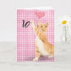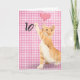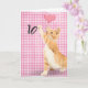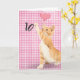 Goldkatze mit rosa Herzballon zum 10. Geburtstag auf rosa und weißem Gingham Hintergrund.