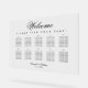 Eine einfache, aber elegante, transparente Hochzeitssitzkarte mit 10 Tischen in 2 Reihen. Der Titel "Willkommen" oben und die Namen der Braut und des Bräutigams unten sind in einer eleganten Kalligraphie geschrieben, die Erholung in Kappen. Der gesamte Text ist schwarz.
