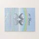 Zwei Zinn- oder Aluminiumherzen schwimmen unter einem Regenbogen auf dem Wasser. Der Text "10 Jahre" steht für anpassbar.