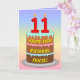 Dieses fröhliche und lustige Geburtstagskarten-Design zeigt eine Cartoon-Darstellung eines dreistufigen Geburtstagskuchens mit numeralförmigen Kerzen oben, die die Zahl "11" zeigt, zusammen mit der Meldung "GLÜCKLICHER 11. BIRTHTAG" und einem bearbeitbaren Empfängernamen. Der Hintergrund der Vorderseite weist ein farbenfroh pastellfarbenes Regenbogenspektrum mit inspiriertem Farbverlauf auf. Im Inneren befindet sich eine individuell angepasste Geburtstagsgrüßbotschaft, oder man könnte sie löschen und leer verlassen werden, wenn eine Nachricht von Hand geschrieben werden soll. Eine optimistische, maßgeschneiderte Geburtstagskarte wie diese könnte eine lustige Art sein, jemandem, der seinen elften Geburtstag feiert, Geburtstagswünsche zu schicken. [~Z0000625]
