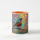 This 11 oz Combo Mug is ceramic with color on the inside and on the handle. The rest of the mug is white with the colorful image of a bird on the front.