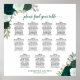 Ce magnifique tableau de sièges boho chic à fleurs vous permettra de trouver facilement vos tables à votre réception de mariage. Le design présente de magnifiques roses d'aquarelle peints à la main dans de jolies teintes vert émeraude et sauge, ornés de sprigs de feuilles de jardin et de feuillage. Le titre de calligraphie complexe ajoute une touche de sophistication supplémentaire. Avec un espace suffisant pour accueillir jusqu'à 110 noms à 11 tables, chacune d'une capacité de 10 invités, le tableau inclut également le nom du couple et la date du mariage en bas.