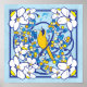 Ein im Jugendstil gehaltener Singvogel sitzt auf einem Ast mit Beeren und Blume. Dieser einzigartige quadratische Druck wird in Blau- und Gelbtönen ausgeführt.