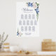Helfen Sie Ihren Gästen, ihren Tisch mit dieser blauen und weißen Rosenblütenkarte zu finden. Es ist für eine Hochzeit mit 13 Tischen und 130 Gästen geeignet.