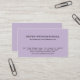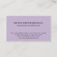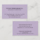 Ce carte de visite élégant affiche vos informations de manière propre et professionnelle en utilisant une police noire moderne sur un arrière - plan de couleur violet clair. Cette conception est adaptée à tous les besoins. Les Cartes de visite sont un excellent outil de marketing pour les entreprises et les propriétaires de petites entreprises afin de promouvoir leurs services ou leurs produits dans de nombreux domaines d'activité comme l'éducation, le conseil, la finance, l'assurance, l'immobilier, la santé, la beauté, la condition physique, le style de vie, la voiture, l'informatique, l'informatique et bien d'autres encore. Sur ce carte de visite moderne et élégant, le nom et les lignes d'information d'affaires sont accentués par une ombre subtile. Vous pouvez choisir votre propre couleur de arrière - plan ou de police et vous pouvez également changer la couleur de l'ombre en customisant le design avec des outils de design Zazzles. Customisez le texte à l'arrière de la carte pour informer les clients et les partenaires commerciaux de votre service ou de vos produits ou supprimer les champs de texte dont vous n'avez pas besoin. Si ce carte de visite est destiné à un usage privé, vous pouvez ne pas donner trop d'informations pour protéger votre sécurité. Dans ce coque, vous pouvez utiliser le recto de la carte pour imprimer votre nom et vos e-mails et inscrire votre numéro de téléphone au verso de la carte lorsque vous la distribuez. Montrez votre professionnalisme à vos clients et amis et faites une impression durable en choisissant des tirages professionnels cartes de visite Zazzles.