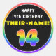 Dieses fröhliche und optimistische Geburtstagsthema rundet das Design mit einer großen Zahl "14" mit einem farbenfrohen Regenbogenspektrum inspirierten Farbverlaufsmuster ab, zusammen mit der Meldung "HAPPY 14. BIRTHDAY" und einem bearbeitbaren Empfängernamen. Glückliche Geburtstagsaufkleber wie diese können bei einer Geburtstagsparty für jemanden verwendet oder ausgegeben werden, der seinen vierzehnten Geburtstag feiert oder vielleicht bei der Vorbereitung von Geschenken oder Einladungen für eine solche Veranstaltung verwendet wird. [~Z0000637]