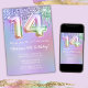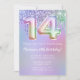 Invitation de 14ème anniversaire parties scintillant rose violet goutte d'invitation de 14ème anniversaire pour une fille de 14 ans avec écriture de script moderne et des ballons de papier amusant.
