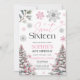 16 . Geburtstag Geburtstag Einladungen mit rosafarbenen und silbernen Schneeflocken und Pinienbäumen. Ideal für Ihre 16. Geburtstagsfeier im Winter.