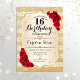 Einladung zum 16. Geburtstag. Elegantes Design in Gold und Rot. Features Imitate Glitzer goldene Streifen, rote Rosen stilvolle Skript-Schriftart und Konfetti. Ideal für eine gläserne Geburtstagsfeier.
