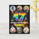 An der Vorderseite dieser kühnen und lustigen Geburtstagskartendesign steht die Nummer "17" mit einem inspirierten Farbverlauf aus Regenbogenspektrum, die Meldung "HAPPY 17. BIRTHDAY" und ein personalisierter Name auf einem farbenfrohen Feuerwerk inspiriert Muster. In der Nähe von oben und unten sind Bilder, die individuell angepasst werden können, vielleicht mit Fotos der Familie und Freunden des Empfängers. Im Inneren befindet sich eine personalisierte Geburtstagsgrüßbotschaft, oder man könnte sie löschen und leer verlassen werden, wenn eine Nachricht von Hand geschrieben werden soll. Eine fröhliche, editierbare Geburtstagskarte wie diese könnte dazu verwendet werden, jemandes siebzehnten Geburtstag zu feiern. (Fotografie © Storytree Studios, Stanford, CA.) [~Z000660]