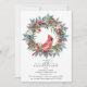 Ein eleganter roter Kardinal, eingebettet in einen Wintergrün-Kranz, lädt Gäste zu Ihrer Winter- oder Weihnachts-Geburtstagsfeier ein. Das Aquarell-Design zeigt einen schönen Kardinal und einen Tannenkranz, der mit roten Blumen und Beeren sowie Tannenzapfen dekoriert ist.