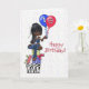Eine niedliche Karte für ein 18-jähriges Mädchen. Auf der Karte befindet sich ein mit Augen, dunkelhäutiges Mädchen, das auf einem Paket sitzt, das Ballons hält. Confetti Hintergrund.