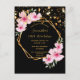Une floraison tropicale sous les étoiles 18ème anniversaire invitation avec fleurs d'hibiscus roses, verdure et un cadre géométrique en faux or et étoiles dorées. Arrière - plan noir élégant. Modèles pour un nom écrit avec un script moderne de style manuscrit, modèles pour vos informations de fête. Texte noir. Parfait pour un été, une piscine ou une fête de plage ! Dos : couleur arrière - plan noire et étoiles dorées.