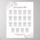 Diese schöne Hochzeitskarte bietet Tischbelegungen für 190 Gäste, mit 10 Personen an jedem Tisch. Das Design ist einfach und elegant mit dunkelgrauem und rotem Text auf weißem Hintergrund. In den Ecken sind silberne Imitate und Wirbel, und in der extravaganten Schriftzeichen steht "Finde bitte deinen Tisch".