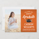 Teilen Sie die Freude eines Gymnasiums oder Uni-Abschlusses mit diesen individuellen Foto-Ankündigungen in Orange, Weiß und Schwarz. (IMAGE PLACEMENT TIP: Eine einfache Möglichkeit, ein Bild genau so zu zentrieren, wie Sie es gewollt haben, ist es, es einzuschneiden, bevor Sie es auf die Zazzle-Website hochladen.) Diese Vorlage ist einfach mit jedem beliebigen Wortlaut Ihrer Wahl, wie z. B. Party Einladung, Eltern-Namen, Sonderehren, Studientitel, bevorzugten inspirierenden Zitat, Kontaktinformationen für Absolventen, künftige Bildungen oder neue Stellenangebote, anzupassen. Wenn ein Text nicht gewollt ist, löschen Sie ihn einfach. Das Design umfasst einen orangefarbenen Hintergrund, eine schwarze Mörtel-Kappe, handgeschriebene Schrift-Kalligraphie, eine elegante moderne Typografie und ein Foto Ihrer Wahl, wie z.B. ein Seniorbild oder ein Bild aus der Anlaufzeremonie. Diese eleganten Ankündigungskarten für Abschlüsse sind eine stilvolle Möglichkeit, Ihre Feier mit Freunden und Familie zu teilen. Herzlichen Glückwunsch an den Absolventen!