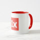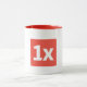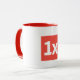 1x Mug, white, with red logo and red details.