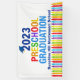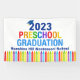 Das bezaubernde Banner der Vorschulabschlussfeier 2023 mit einer coolen Gradmütze über farbenprächtigen Schriften und einer Reihe von Stiften im Regenbogen. Niedlicher Vorschulabsolvent signiert in lustigen Farben für den letzten Grundschultag mit dem in Weiß personalisierten Namen Ihres Kindes. Herzlichen Glückwunsch an unsere PreK Absolventen!