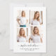 Diese einfache, aber ultramoderne Ankündigung von Abschlüssen beinhaltet vier Ihrer bevorzugten persönlichen Fotos in einem einzigartigen, vielschichtigen Look Foto Raster. Das Schwarz-Weiß-Kartendesign weist den Namen des Absolventen in eleganter, trendiger, handgeschriebener Schrift-Typografie auf und hat einen Platz für die Schule und Klasse der 2023 Informationen in einem koordinierenden serifenlosen Schriftart. Es gibt Platz für ein weiteres Foto (insgesamt fünf Fotos) und eine persönliche Nachricht auf der Rückseite.