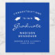Feiern Sie den Meilenstein Ihres Absolventen stilvoll mit diesen individuellen Weinflaschen-Etiketten aus Abschluss, die mit den Worten "Herzlichen Glückwunsch an unseren Absolventen" in weißem Text auf blauem Hintergrund, verziert durch ein Paar weißer Mörtel-Pappkappen. Das Wort "Graduate" erscheint in einem anmutigen Skript im Handschriftenstil. Personalisieren Sie es mit dem Namen, der Schule und dem Jahr des Abschlusses.