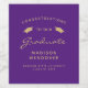 Feiern Sie den Meilenstein Ihres Absolventen stilvoll mit diesen maßgeschneiderten Weinflaschen-Etiketten aus Abschluss, die mit den Worten "Herzlichen Glückwunsch an unseren Absolvent" in goldfarbenem Text auf einem lila Hintergrund, geschmückt mit einem Paar goldfarbener Mörtelpappenkappen. Das Wort "Graduate" erscheint in einem anmutigen Skript im Handschriftenstil. Personalisieren Sie es mit dem Namen, der Schule und dem Jahr des Abschlusses.