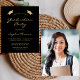 Diese klassische, moderne Graduiertenparty mit goldfarbenem Text auf schwarzem Hintergrund. Das Wort "Abschluss" und der Name des Absolventen erscheinen in einem lässigen modernen handschriftlichen Schriftart unter einem Paar goldfarbener Mörtelpappenkappen. Passen Sie die Einladung mit Party-Details an, und ersetzen Sie das Beispielbild auf der Rückseite durch ein Foto Ihres Abschlusses.