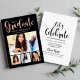 Einfach stilvolle Black Abschluss-Anzeigenkarte und Party Einladung mit "2024 Graduate" in einem modischen Real-Folie-Kalligraphie-Skript mit einer modernen Foto-Collage von vier (4) Fotos des Abschlusses. Das zweiseitige Kartendesign beinhaltet den Wortlaut der Graduierungspartei "Let's Celebrate" und Details auf der Rückseite. Klassisches Schwarz-Weiß-Design mit goldfarbenen Akzenten in Rose.