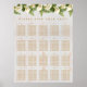 Le tableau de sièges mariage comporte 20 tables. Sur la bordure supérieure, il y a une guirlande de lys calles blancs et de fougères. L'arrière - plan est en marbre blanc. Tout le texte est de couleur dorée. Les lys calla blancs et la fougère proviennent d'une carte de voeux vintage de Bertha Maguire (1862-1910), désormais dans le domaine public.