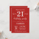 Einladung zum 21. Geburtstag mit rotem Hintergrund. Erwachsener Geburtstag. Männer oder Frauen laden ein. 13. 15. 16. 18. 20. 21. 30. 40. 50. 60. 70. 80. 90. 100. Jegliches Alter. Für weitere Anpassungen klicken Sie bitte auf die Schaltfläche "Anpassen" und verwenden Sie unser Designwerkzeug, um diese Vorlage zu ändern.