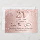 Eine trendige und mädchenhafte Save the Date-Karte für ein Party zum 21. Geburtstag. Rose goldener Hintergrund verziert mit Rose Gold und Imitate silber Glitzer Tropfen und Staub. Personalisieren und fügen Sie Datum und Namen/Text hinzu. Der Text: Save the Date ist mit einem großen angesagten, handgeschriebenen Stilskript geschrieben. Nummer 21 mit einem Schriftart im Ballonstil.