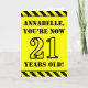 Die Vorderseite dieses lustigen und kühnen Geburtstagskarten-Designs ist mit einem editierbaren Namen und der Meldung "YOU’RE NOW 21 YEARS OLD!" in schwarzem Schablonentext auf gelbem Hintergrund versehen. Die Vorderseite weist auch ein auffälliges schwarz-gelb gestreiftes Muster an den oberen und unteren Rändern auf. Im Inneren befindet sich eine individuell anpassbare Geburtstags-Grußnachricht, oder vielleicht kann gelöscht und links werden, wenn eine Nachricht von Hand geschrieben werden soll. Eine individuell anpassbare Geburtstagskarte wie diese könnte eine lustige Art sein, jemandes 21. Geburtstag anzuerkennen. [~Z0000413]