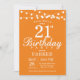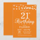 21e Invitation d'anniversaire avec des lampes à cordes. Arrière - plan orange. Invitation anniversaire d'élégante femme ou homme. 13e 15e 16e 18e 20e 21e 30e 40e 50e 60e 70e 80e 90e 100e, n'importe quel âge.