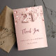 Un carte de remerciements pour un 21ème anniversaire. Couleur arrière - plan rose or dégradé. Avec de l'or rose gouttant des étoiles brillantes. A l'avant : numéro 21 écrit avec une police de style ballon, grand rose foncé écriture manuscrite couleur or et le texte : Merci, votre texte, titre et une date. Retour : Personnalisez et ajoutez Votre note de remerciement et votre nom.