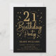 21st birthday party invitation in black and gold. Trendy modern design, perfect for a stylish men's or women's bday celebration. Features script font and confetti. Customize with your own details. Printed Zazzle invitations or instant download digital printable template.