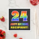 Dieses lustige, farbenfrohe und fröhliche Geburtstagsthema Papierserviette-Design zeigt eine große Zahl "24" und die Meldung "HAPPY BIRTHDAY", beide mit einem inspirierten Regenbogenspektrum-Farbverlauf, zusammen mit einem kühnen gelben editierbaren Empfängernamen. Der Hintergrund ist schwarz. Geburtstagsbespiele wie diese könnten sich bei einem Party zum Feiern des vierundzwanzigsten Geburtstages von jemandem amüsieren. [~Z0000476]