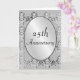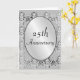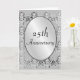 25. Silberne Jubiläumskarte, Einladung oder Ankündigung mit hübschem Damast-Muster in passenden Silbertönen. "25. Jubiläum" Skripttext ist auf dem Cover in einem passenden ovalen silbernen Rahmen. Fügen Sie Ihre eigenen persönlichen Worte auf der Innenseite oder verlass leer, um später zu schreiben. Leicht zu ändernde Texte für Hochzeiten, Geburtstage und andere besondere Anlass-Karten. Eine schöne und persönliche elegante Karte.