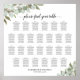 Ce tableau de mariage rustique de 26 tables présente un élégant design boho chic avec des feuilles d'eucalyptus peints à la main, de la verdure et du feuillage de jardin dans les tons menthe, mousse et vert sauge. Il comprend des assignations de table pour 260 personnes avec 10 places par table. Le titre de calligraphie du script de dentelle dit : Veuillez trouver votre table, et les noms du couple et de la date mariage apparaissent en bas. Une façon merveilleuse d'aider vos invités à trouver leurs sièges tout en ajoutant élégance et style à votre réception.