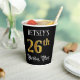 This fancy and opulent birthday-themed paper cup design features an editable name and the message “26th Birthday Party”. The large number “26th” has an imitation/faux gold-inspired coloring pattern, and the words “Birthday Party” are in elegant script-style text. The background is colored black by default (although it can be customized). Luxurious, ornate paper cups like this might be used at a birthday party/celebration being held to celebrate somebody’s twenty sixth birthday. [~Z0000567]