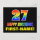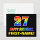 Die Vorderseite dieses fröhlichen, lustigen und bunten Geburtstags-Thema Postkartendesign zeigt eine große Zahl "27" und die Meldung "HAPPY BIRTHDAY", beide mit einem inspirierten Regenbogenspektrum, zusammen mit einem kühnen gelben personalisierten Empfängernamen. Die Vorderseite hat einen minimalistisch schwarzen Hintergrund. Die Rückseite der Postkarte hat eine individuelle Geburtstags-Grußmeldung, oder könnte gelöscht und links werden, wenn eine Nachricht von Hand geschrieben werden soll. Eine lebendige personalisierte Geburtstagskarte wie diese könnte eine lustige Art sein, jemandes siebenundzwanzigsten Geburtstag zu feiern. [~Z0000474]