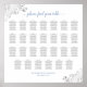 Cette belle carte de sièges mariages a des places pour 27 tables à 10 places par table ou 270 places. Il présente un design simple mais élégant avec du texte gris foncé et bleu clair sur un arrière - plan blanc et un faux film décoratif en dentelle argent filigree dans les coins. Le titre est écrit en calligraphie de script sophistiqué et dit : Veuillez trouver votre table. Design et raffiné !