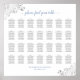 Dieses schöne Hochzeitssitzdiagramm zeichnet sich durch ein schlichtes, aber elegantes Design aus, mit dunkelgrauem und hellblauem Text auf weißem Hintergrund. Der Titel ist in Skriptkalligraphie geschrieben und liest: Bitte finden Sie Ihre Tabelle. Das Diagramm ist mit einem kühnen blühenden Imitat Folie silberne Bordüren und Wirbel in den Ecken dekoriert. Enthält Sitzplätze für 28 Tische für 10 Personen pro Tisch oder 280 Gäste.
