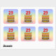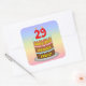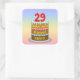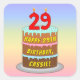 This joyful and fun birthday-themed square sticker design features a cartoon-style depiction of a three-tier birthday cake having number-shaped candles on top showing the age “29“, along with the message “HAPPY 29TH BIRTHDAY,”, and a custom recipient name. The background features a multicolored pastel rainbow spectrum inspired gradient pattern. Cheerful birthday themed stickers like these might be distributed or used at a party for somebody who is celebrating their 29th birthday, or perhaps used when preparing presents or invitations for such an event. [~Z0000624]