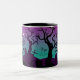 Graveyard violet, turquoise conception de la tasse d'Halloween, avec un cimetière avec des arbres éffrayants, des tombes, des croix, une sorcière, des fantômes et des nuages et le croissant de lune sur l'arrière - plan pourpre et turquoise.